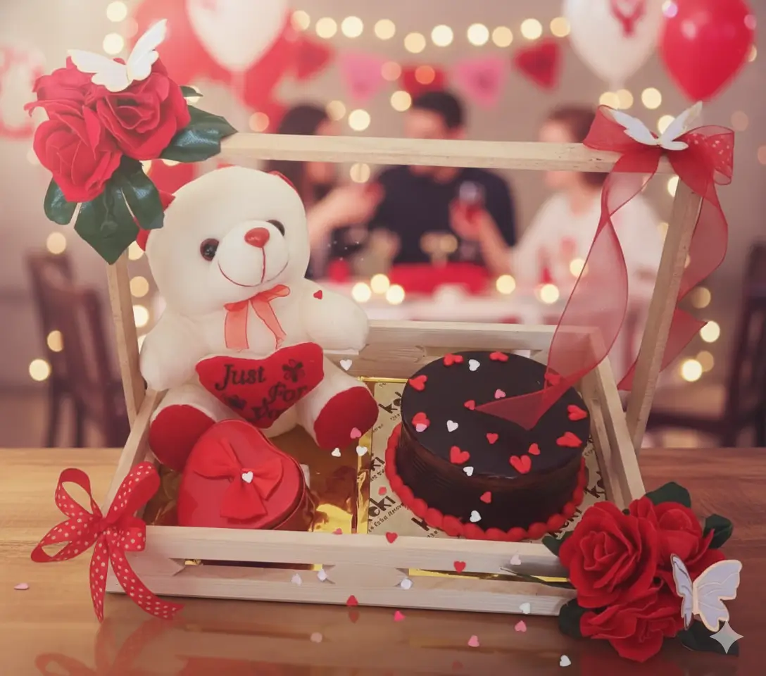 Turn Valentine’s Day into an unforgettable celebration with The Valentine Indulgence Hamper—a thoughtfully curated blend of sweetness, warmth, and romance. This charming hamper includes a beautifully crafted heart-themed cake, paired with a soft teddy bear holding a love message, all presented in an elegant wooden-style tray adorned with roses, ribbons, and festive accents.